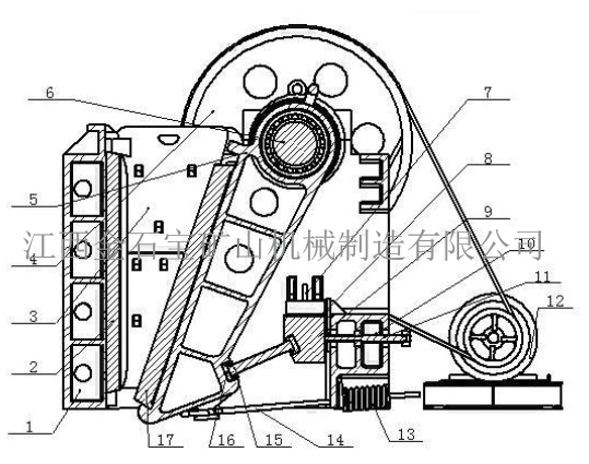 10.拉紧螺栓 11.顶杆螺栓 12.电动机 13.弹簧 14拉杆 15.肘板 16.肘板垫 17.活动鄂板